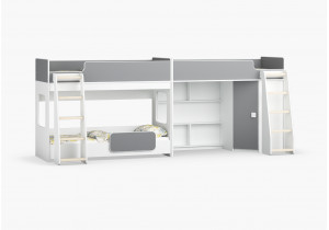 - Составная трехъярусная кровать – это две или три кровати, стоящие рядом. Такой комплект может состоять из двухъярусной кровати и кровати-чердака, что дает определенное преимущество в виде игровой зоны под одним из верхних спальных мест. В этом случае все места для сна параллельны друг другу и находятся на одном и том же расстоянии от стены. Также можно составить трехъярусную кровать из трех кроватей: двух чердаков и низкой кроватки, которая отлично вписывается под одним из чердаков. Зачастую нижняя кровать располагается перпендикулярно, что, с одной стороны, освобождает дополнительное место под чердаком, а с другой – перекрывает часть места, так как кровать выдается вперед. Данный набор отлично вписывается по двум прилегающим стенам комнаты, как угловой.