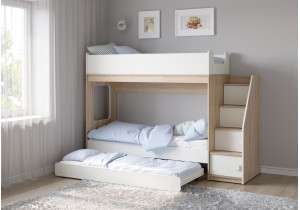 - Трехъярусную кровать с выкатным спальным местом обычно выбирают для максимальной экономии пространства. Все спальные места параллельны друг другу, два верхних являются стационарными, а нижнее (чуть меньшее по размеру) закатывается под среднее и выкатывается из-под него. Если семья только планирует третьего ребенка, этот вариант подойдет на будущее. В этом случае выдвижную кровать можно не оснащать матрасом – получится большой ящик для хранения. Также это место возможно для временных ночевок – если, например, гостит бабушка. Самое нижнее спальное место легко прячется, совершенно не занимая дополнительного места в течение дня. К такой кровати обязательно нужна лестница, чтобы дети могли забираться на самое верхнее место. Подойдет прямая лестница, занимающая крайне мало места; либо массивная угловая лестница с секретом – каждая ступень является маленьким шкафчиком.