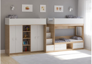 Для троих детей необходимо втрое больше вещей. Количество одежды, игрушек, учебных принадлежностей, постельного белья – всё надо умножать на три. Поэтому хорошим решением будет приобретение комплекта кроватей с мебелью для хранения. В комплект могут входить полки, столы, шкаф, ящики. Вам остается только решить, какие именно модули нужны для вашего помещения.