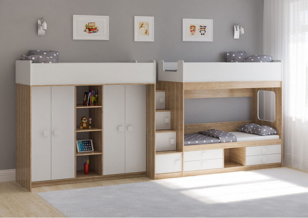 Две кровати, два шкафа, 4 выдвижных ящика – одна лестница.
